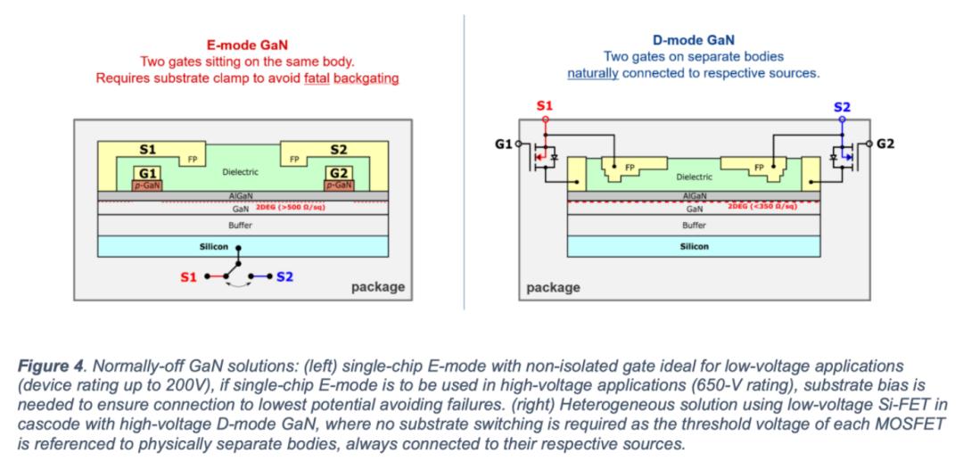 瑞萨指出,E-mode GaN BDS的两个栅极共用同一个衬底和缓冲层,高压下会因寄生背栅效应导致阈值电压不稳定,可能引发误导通或电阻急剧上升。因此需要额外的衬底钳位电路,但这会占用芯片面积、引入瞬态滞后,并限制器件的dv/dt,使设计者无法充分利用其低输出电容和快速开关的优势。