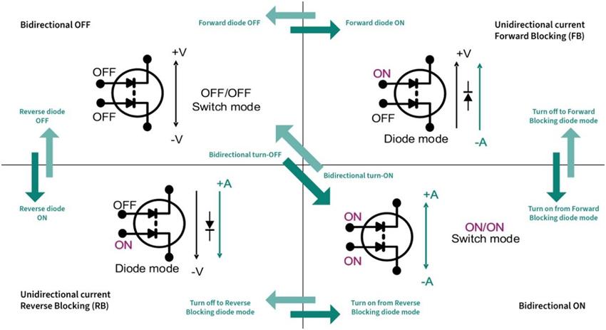 BDS也不再只是控制“开”“关”两种状态,而是控制四种不同状态:导通(两个栅极均导通)、关断(两个栅极均关断)、正向阻断(栅极1导通、栅极2关断,电流方向:漏极→源极)以及反向阻断(栅极2导通、栅极1关断,电流方向:源极→漏极)。