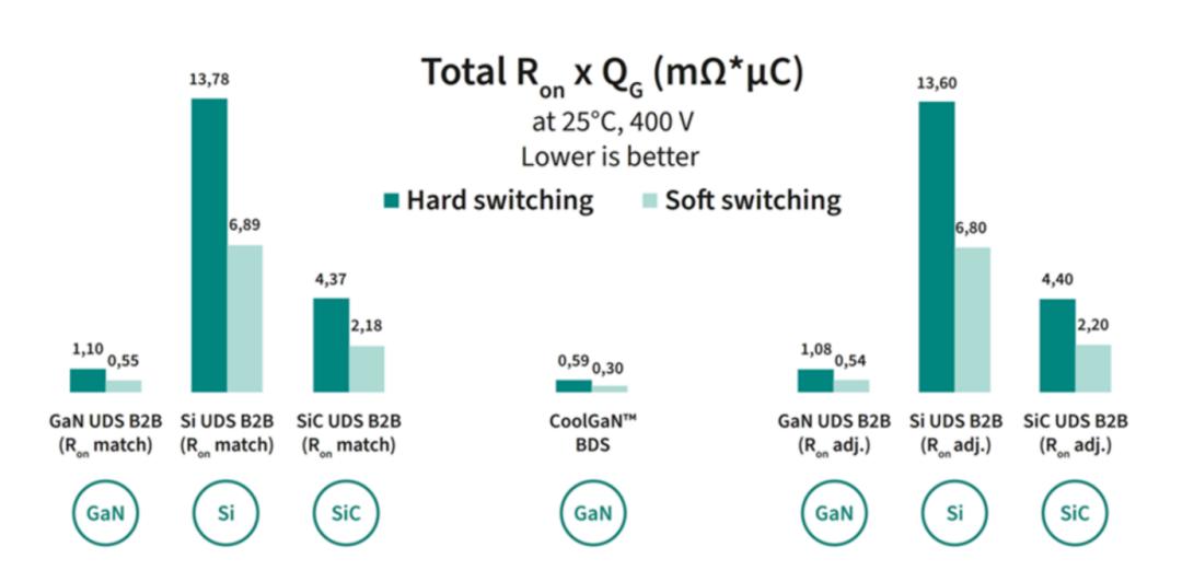 不同技术(GaN、Si和SiC)下的双向开关与单向开关B2B配置的FOM对比
