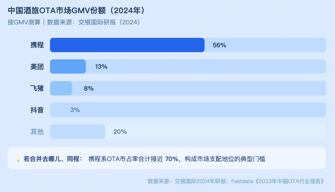 按交银国际2024年测算,以GMV口径计,携程在国内酒旅市场的份额高达56%,若再加上关联的去哪儿和同程,携程系合计市场份额接近70%。机票、酒店、火车票、周边游,几乎所有主流品类的定价权,都归到了这一个体系里。