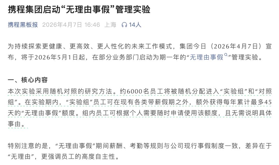 说是要从5月1日起,在部分部门搞一个“无理由事假”实验,随机抽取约6000名员工,进实验组的人,每年可以额外申请最多45天的事假,不用说原因,想请就请。