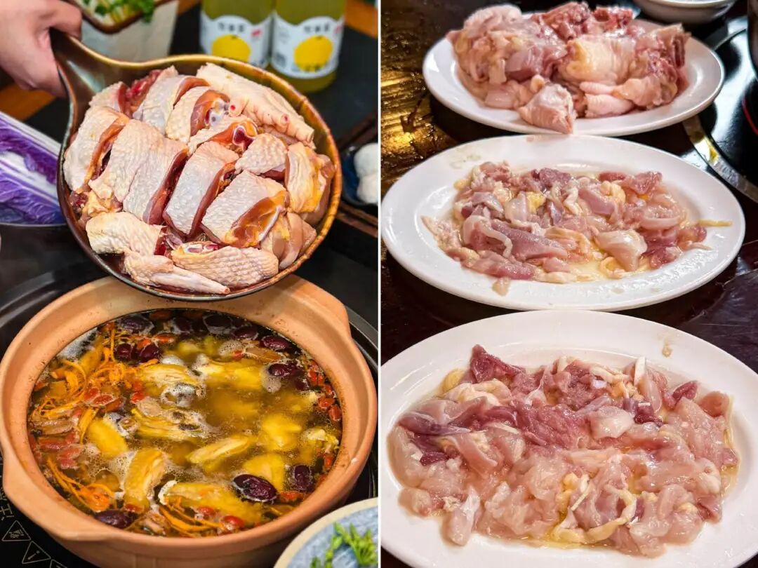 传统广式鸡煲以药膳为基底,常见清补凉、五指毛桃等锅底,讲究“炭炉慢焗、锁住肉香”。而近年来,潮汕创新土鸡煲,采用潮汕牛肉火锅的分部分鲜切模式,吸引了不少消费者的喜爱。