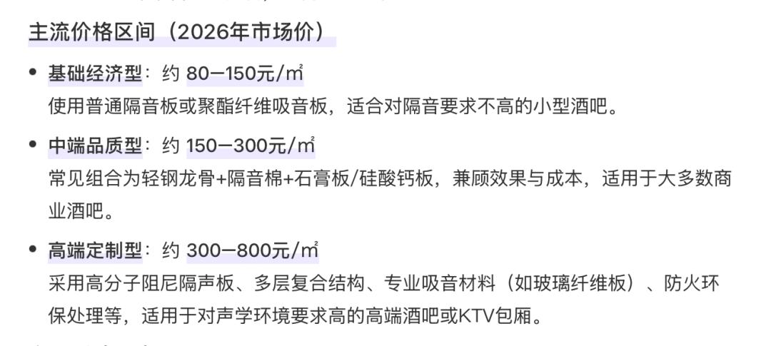 有从业者提到,很多馄饨酒馆开在社区附近,必须要做隔音,而隔音工程是装修的大头。市面上隔音墙的造价因材料有所不同,100㎡小酒馆隔音墙的总费用大致在2.5万到16万元之间。