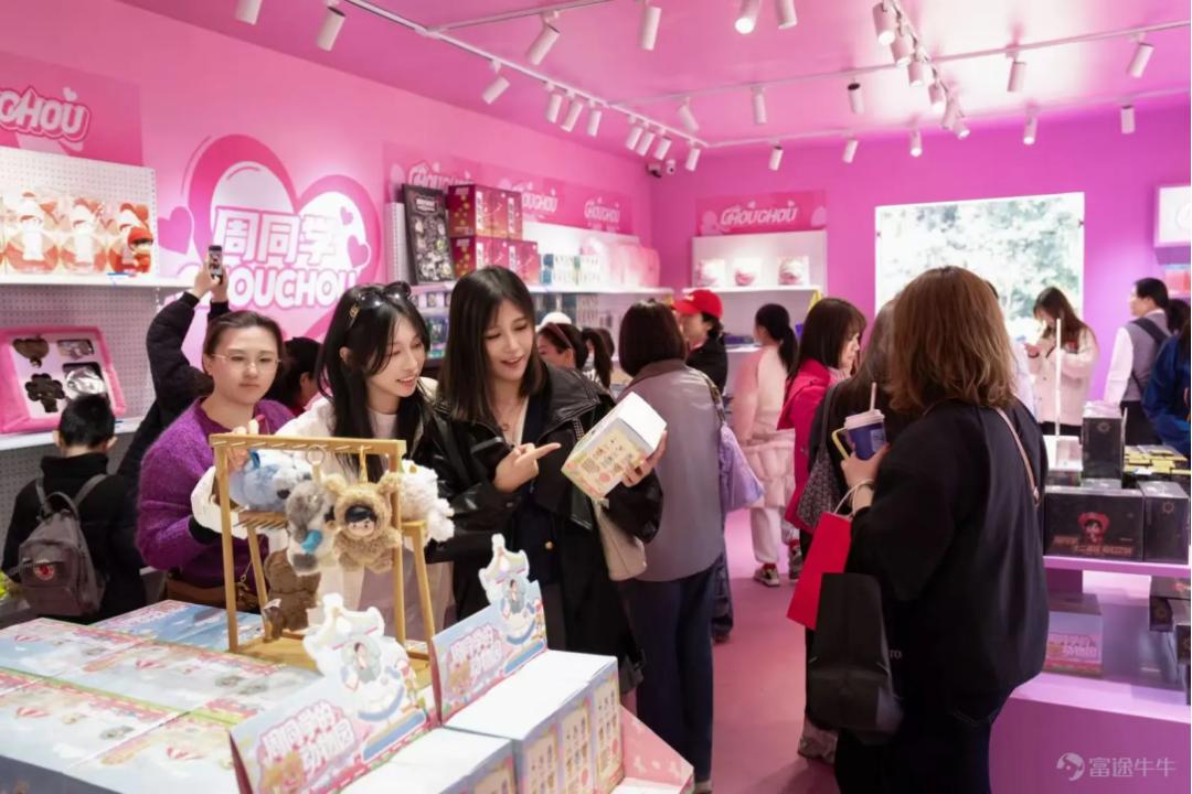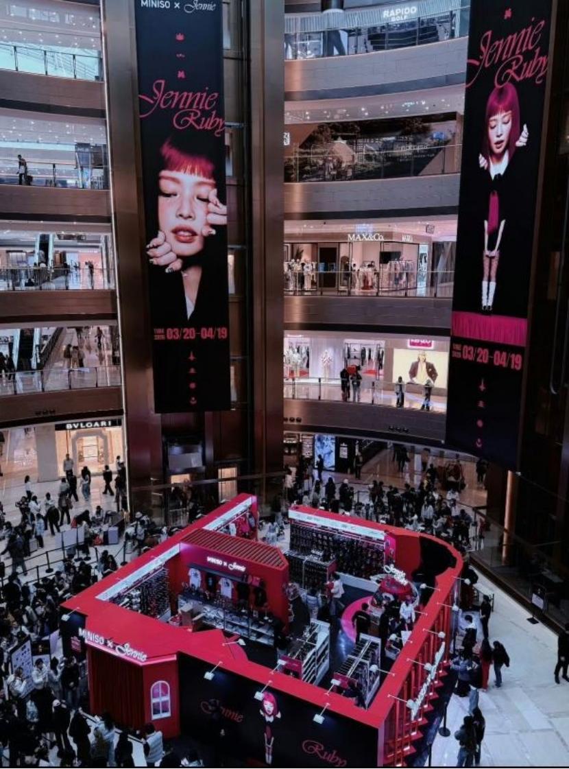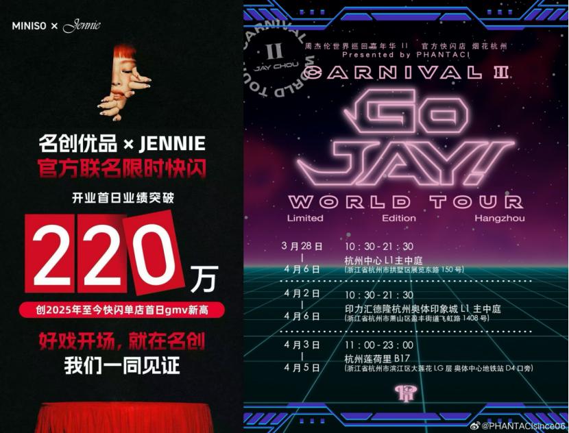 与此同时,两个特殊的案例出现了,名创优品与韩国顶流偶像Jennie联名的限时主题店,首日单店GMV就冲破了220万;周杰伦的官方IP“周同学”也在杭州开出了快闪店,声量可观。