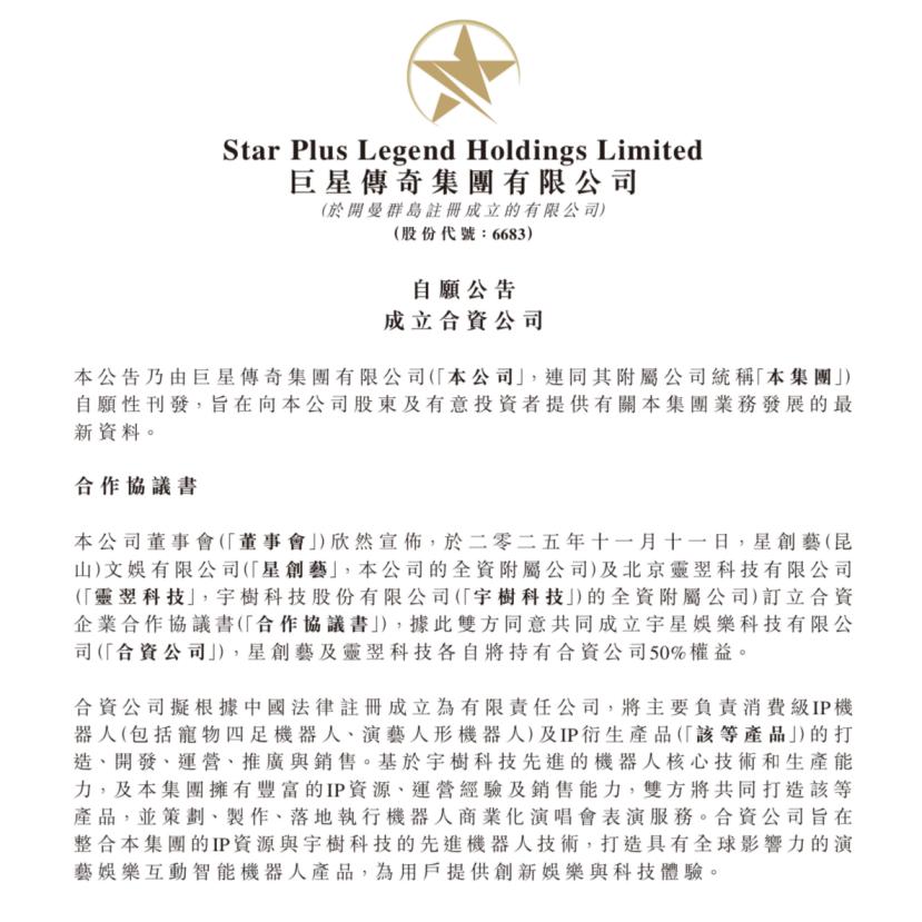 国内的娱乐公司也敏锐地捕捉到了这一趋势。运营周杰伦IP的巨星传奇,已经战略投资了韩国拥有权志龙IP的经纪公司Galaxy,意图将“周同学”的模式复制到海外。2025年9月,巨星传奇与宇树科技共同打造的四足机器狗首次亮相,巨星传奇财报显示,这款融合了明星IP、潮玩属性与科技功能的产品吸引了市场广泛关注。2025年11月,双方宣布拟成立合资公司,负责消费级IP机器人、演艺人形机器人及IP衍生产品的打造与运营。