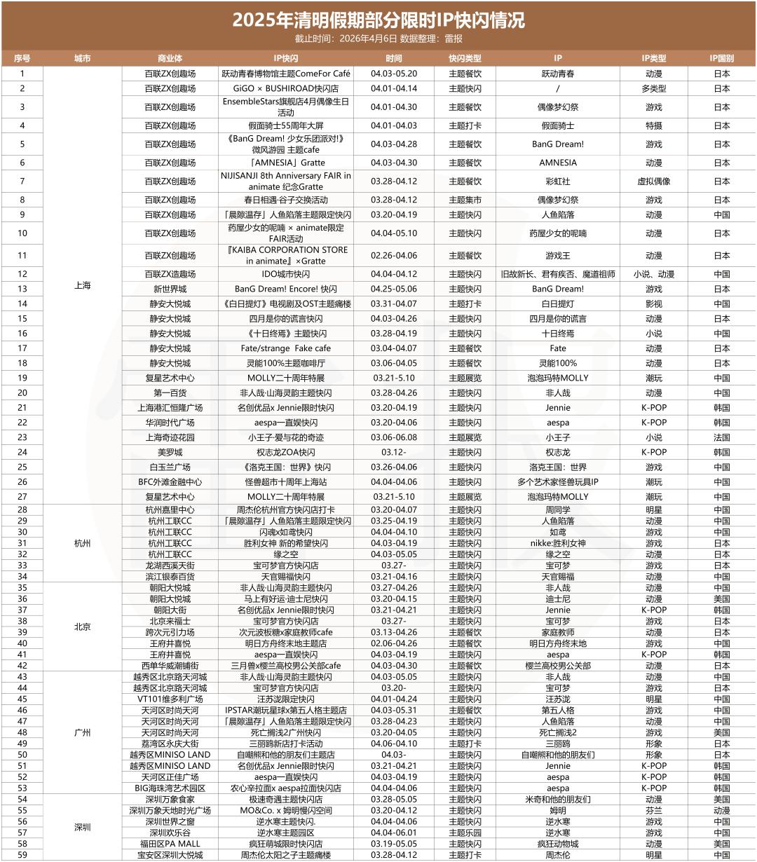 清明小长假,这把火还在烧。根据我们近期的观察与不完全统计,北京、上海、广州、深圳、杭州这五个消费力最强的城市,在清明假期期间又集中落地了接近60场IP快闪活动。从春节到清明,短短一个多月,上百场IP快闪在这些核心城市里轮番上演。