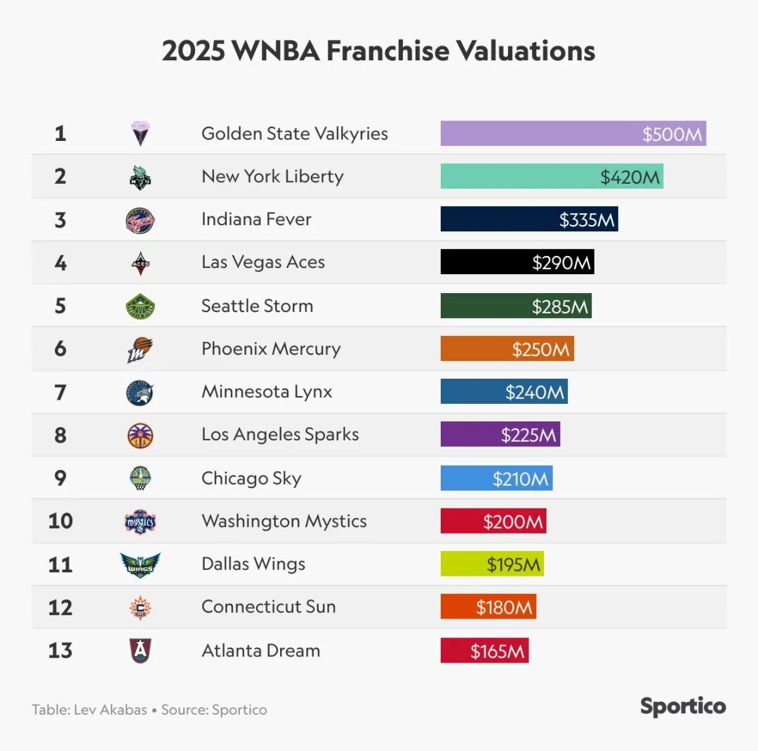 根据《Sportico》此前发布的榜单,WNBA在2025年的球队平均估值已经达到2.69亿美元,相比2024年有180%的涨幅。太阳队最终以3亿美元成交,算是卖在了一个相当理想的位置。