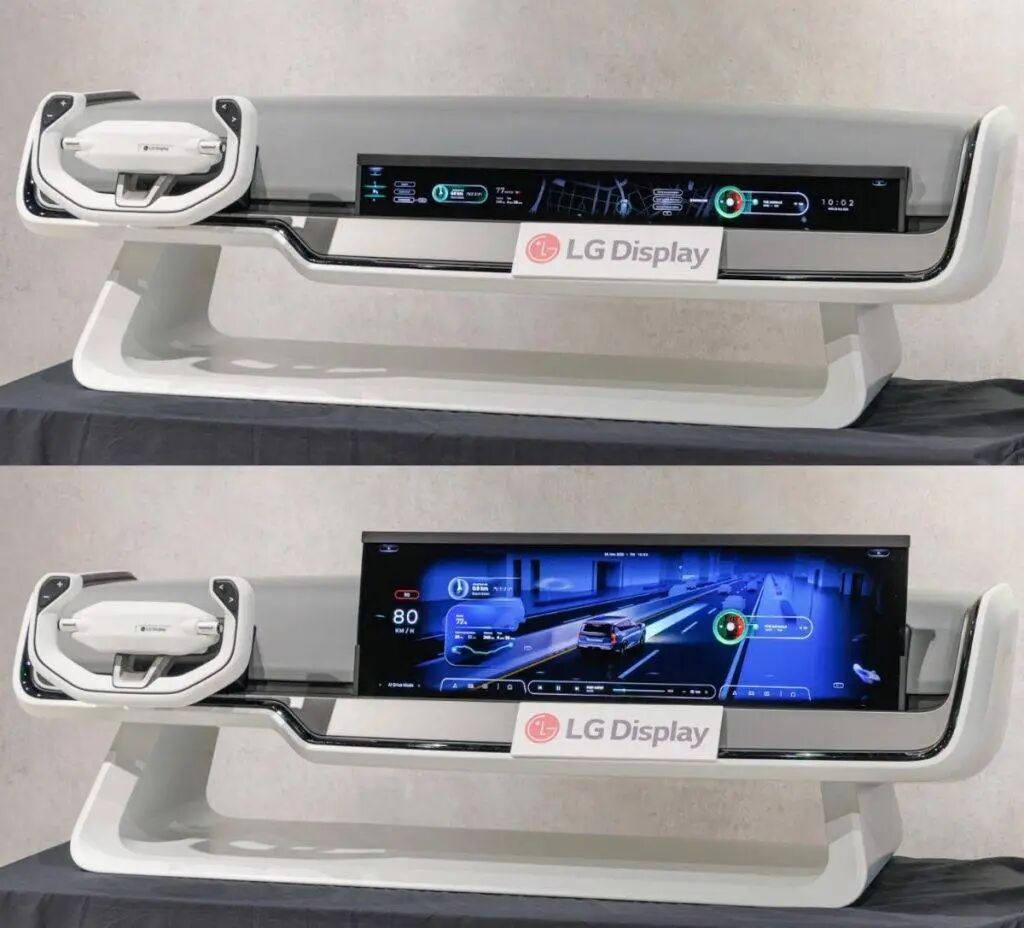 我更看好的是 LG 在今年 CES 上展示的「卷轴屏」车机屏幕:驾驶过程时,车机屏幕以小尺寸显示导航等基础信息;而驻车时,则能够扩展到 33 英寸的大屏形态,兼顾娱乐作用。