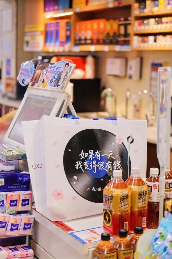 他解释说,叔,最近支付宝搞了个碰一下×武汉的活动,在有家便利、可多便利这些门店买完东西,手机碰一下付款,就能领一个印着毛不易歌词的购物袋,最近成为了街头潮流单品。