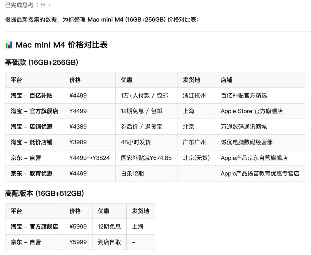 我首先体验了QBotClaw的自动比价能力,我的需求是“帮我对比Mac mini在淘宝、京东的价格、优惠、发货地,生成对比表。”