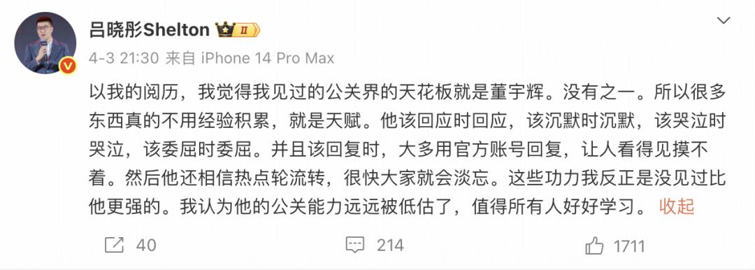 当然,也有人总结称,与辉同行在这起事件中,网红投资人吕晓彤就在微博上称,“我觉得我见过的公关界的天花板就是董宇辉”,具体行动指的是,“他该回应时回应,该沉默时沉默,该哭泣时哭泣,该委屈时委屈”。