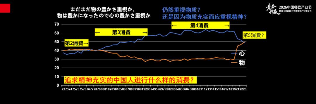 这是日本政府的一项调查,蓝色的线指的是,在物资非常充裕后开始追求精神丰富的民众数量,1970年只有30%的人追求精神丰富,第三消费时代这些人数越来越多。到了第四消费社会,有60%追求精神富足的人,但餐饮行业却在下滑。