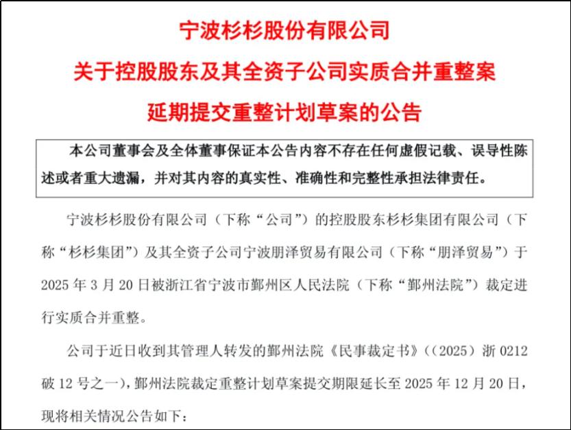 2025年3月20日,宁波鄞州区法院裁定对杉杉集团及全资子公司进行实质合并重整。