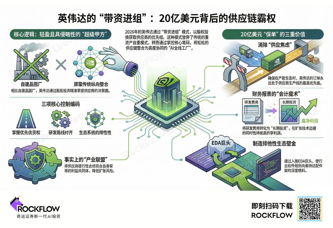② 通过复刻洛克菲勒对“输油管”的控制,英伟达精准锁定了光通信、EDA 工具及云基础设施等咽喉要道。这种投资不仅保障了供应链,它同时利用纳斯达克的估值溢价,将研发费用转化为增厚净值的长期资产,制造出对手无法逾越的生态黑洞。