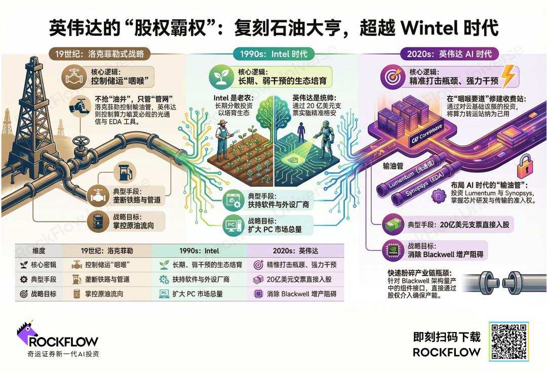 英伟达当下的股权布局,本质上是在 AI 时代复刻 19 世纪末“石油大亨”洛克菲勒的手段,且显著优于 1990 年代“Wintel 联盟”的生态逻辑。
