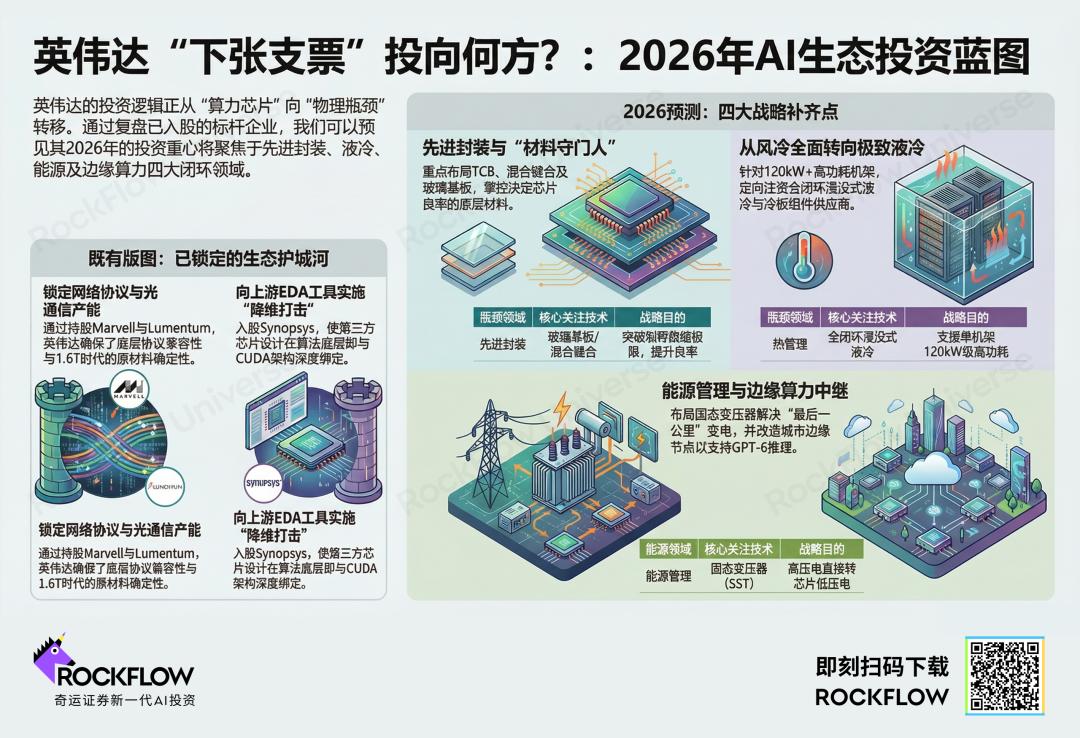 ③ RockFlow 投研团队认为,英伟达的“下一笔投资”正指向最后四个物理瓶颈:能延续摩尔定律的先进封装材料、承载 120kW 机架的极致液冷、解决电力缺口的微型变电技术,以及贴近用户的边缘算力枢纽。