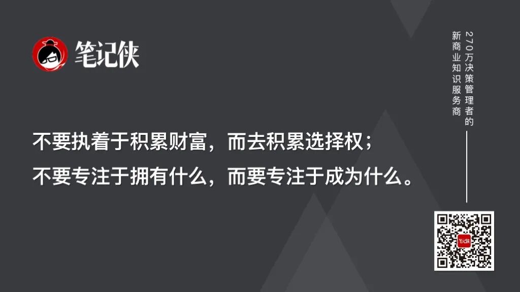 所以我一直劝人:不要执着于积累财富,要去积累选择权和机会;不要专注于“拥有什么”,要专注于“成为什么”。