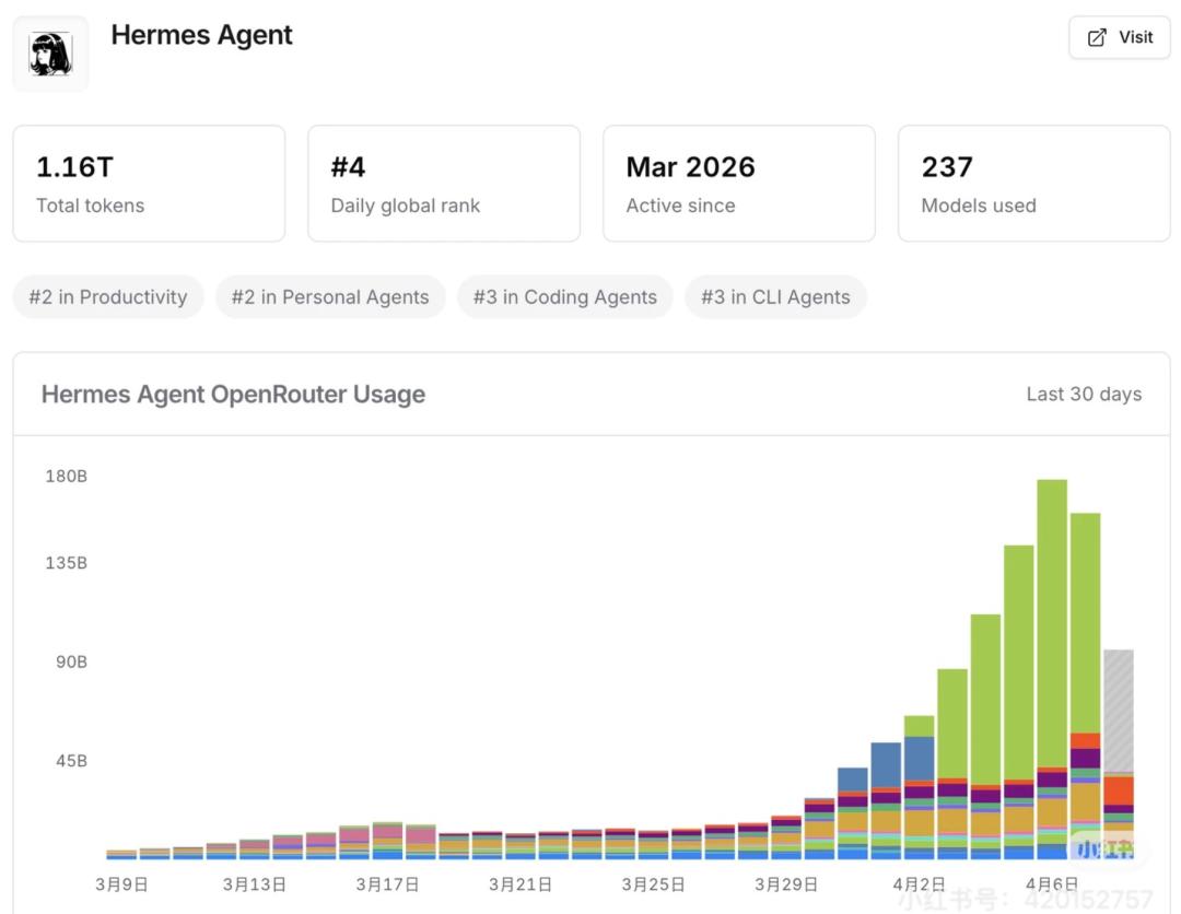 伴随讨论度升温的,是一组很难忽视的数据变化:Hermes的GitHub Star数在短时间内持续攀升,目前已超过35k。OpenRouter上的token使用量从3月下旬开始明显加速,单日使用量连续刷新新高,全球日排名一度进入前列。在 Productivity、Personal Agents、Coding Agents等多个榜单中同时靠前,这对于一个上线不到两个月的Agent框架而言,并不常见。