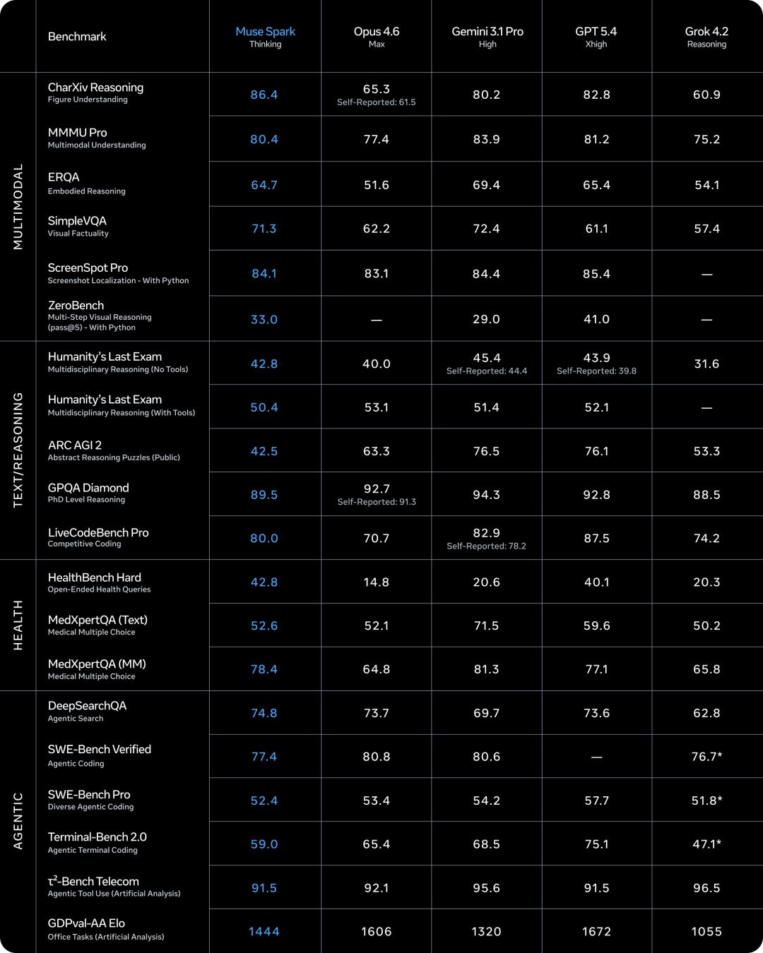 以下是Muse Spark完整的基准测试成绩。需要注意的是,Meta在这里采用了一些有“图表诈骗”嫌疑的数据呈现方式。乍一看,Muse Spark的所有成绩都被标蓝,似乎全面领先,但实际上这一模型在图中的20项基准测试中,拿到的SOTA数量为4个。