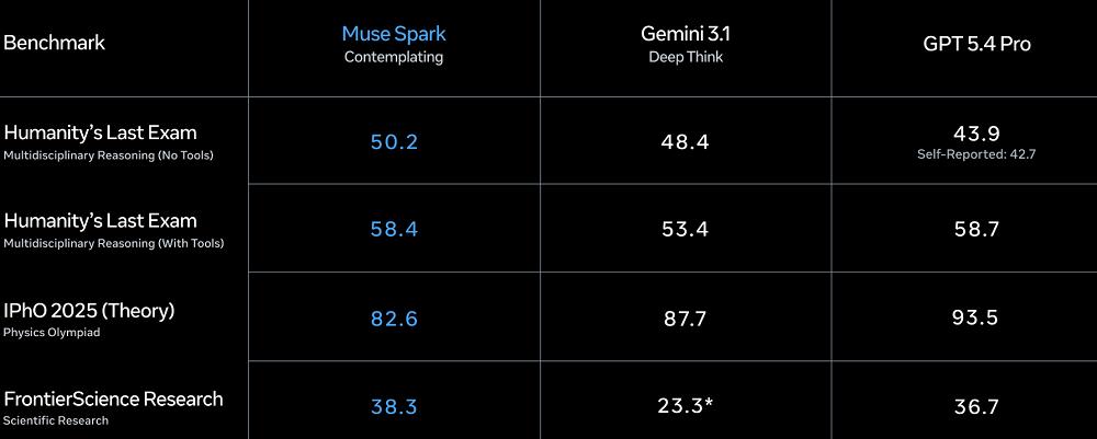 Muse Spark本次还发布了“沉思模式(Contemplating mode)”,该模式可协调多个智能体并行推理。这使得Muse Spark能够与Gemini Deep Think和GPT Pro等前沿模型的极限推理模式相媲美。