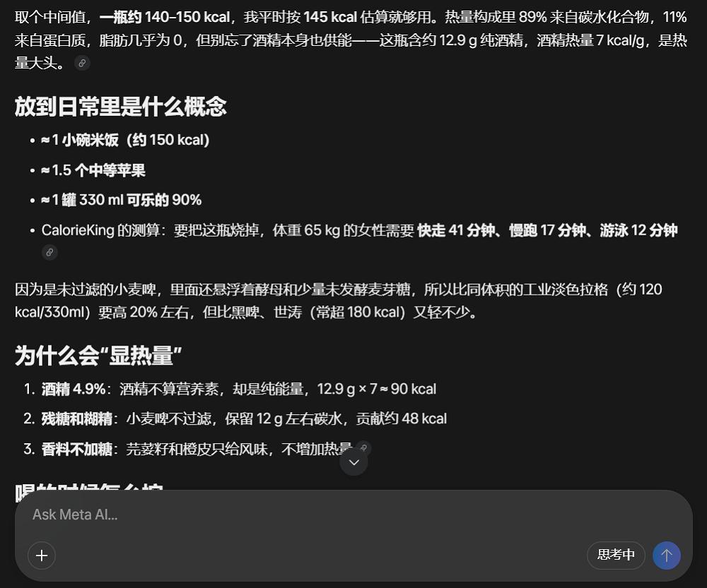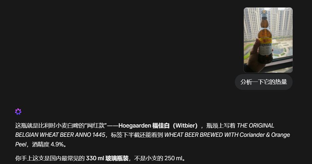 Muse Spark的多模态能力确实不错,我们上传了一个啤酒瓶的照片,让它分析热量。Muse Spark一眼就看出了啤酒的品牌、大小,甚至连原图中肉眼都难以分辨的酒精度都准确识别出来了。