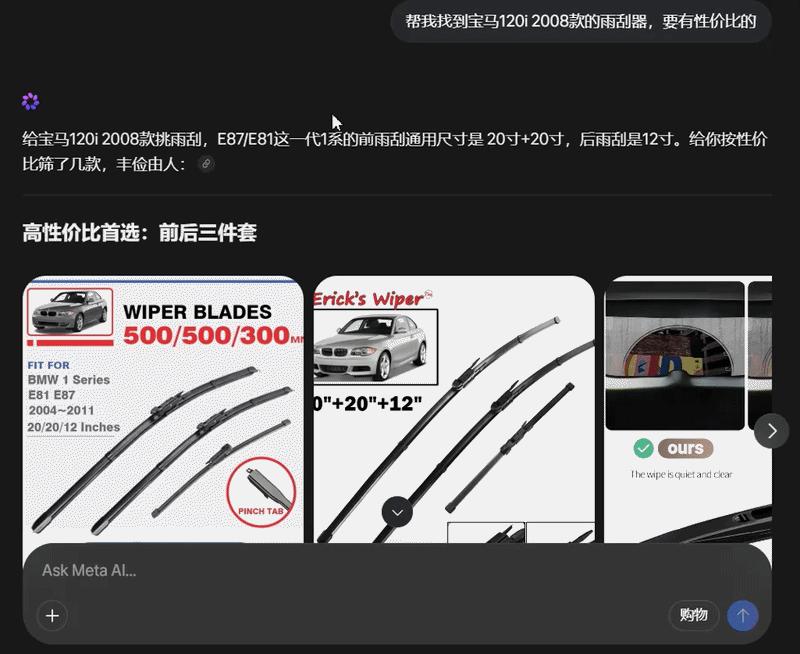 Muse Spark还可用于购物推荐。我们试着让它搜索一款汽车雨刮器,几秒钟就拿到了好几个选项,并且有对每款产品优势劣势的分析和最终购买建议。