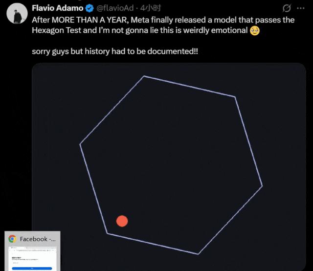 Muse Spark还通过了小球弹跳测试。有网友感叹道,时隔1年多,Meta终于发了一款能通过六边形小球弹跳测试的大模型,这一历史性时刻值得记录。