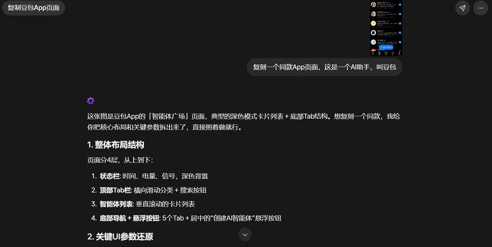 我们第一时间对模型做了体验,上传了一张豆包App的截图,要求Muse Spark复刻。可以看到Muse Spark的回复风格比较口语化,甚至有一股“豆包味儿”,这可能是因为这一模型主要面向C端用户。