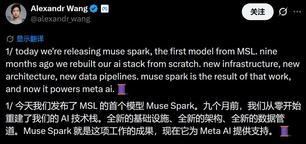 汪滔称,Meta在过去9个月从零开始打造AI技术栈,基础设施、架构、数据管线都是全新的,Muse Spark正是这些努力的成果。