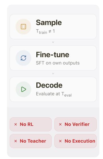 SSD 的实施流程包含三个步骤。首先是数据合成,研究者从基础模型中以较高的温度和特定的截断配置采样生成代码解决方案,每个问题仅采样一个解;然后是训练阶段,直接使用这些未经验证的原始输出作为目标,进行标准的监督微调;训练完成后,使用经过微调的模型,并在特定的解码参数配置下进行评估测试。