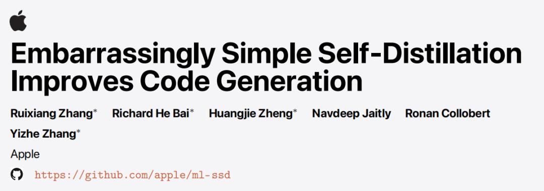 日前,苹果团队近期提出了一种名为“简单自蒸馏”(Simple Self-Distillation,SSD)的方法。该方法以特定温度和截断配置从模型自身采样解决方案,直接使用这些未经验证的样本进行标准监督微调(SFT)。