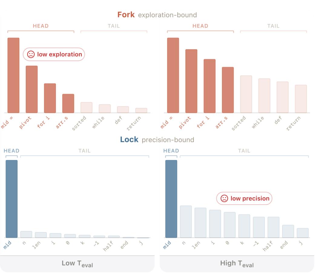 固定的全局解码温度难以同时满足这两者的要求。低温设置能确保 lock 的精确,但会限制 fork 的多样性。高温设置虽然能促进 fork 的探索,却会破坏 lock 的稳定性。
