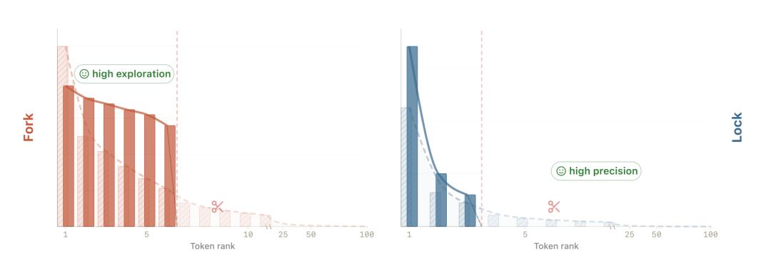 代码生成过程中存在两类特定位置。第一种是锁(lock),分布呈现尖锐峰态,其中极少数 token 携带大部分质量,而较长的干扰尾部则承载其余部分,需要精确性。第二种是叉(fork),分布跨越多个合理 token 的位置,可能导致下游延续产生显著差异,需要探索性。