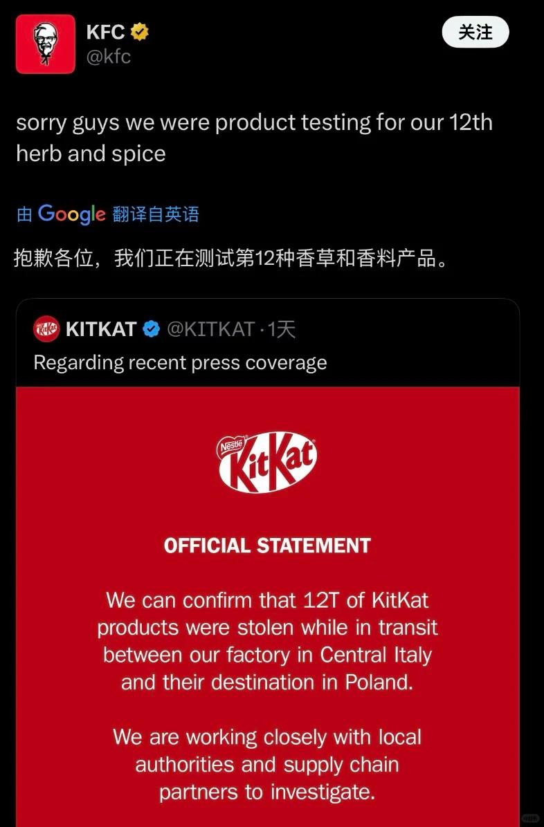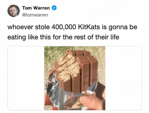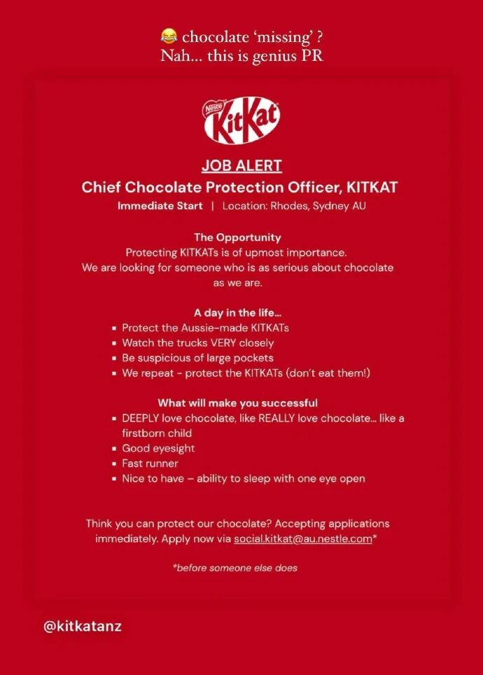 品牌公关倒是很幽默地把这次偷盗事件变成了一次优秀的危机公关教科书,用品牌的广告语“have a break”自嘲,说“我们一直鼓励大家‘来个KitKat休息一下’,但小偷们显然把这句话理解得太字面了”,并表示“认可犯罪分子的独特品味”,后面甚至还发了一个巧克力保镖的招聘启示。