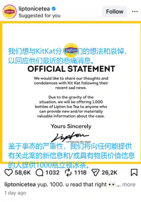 当全世界都在往伤口上撒盐的时候,只有立顿还有点良心,站在了KitKat一边,宣布要拿出1000瓶立顿茶饮料奖励能提供线索的人。