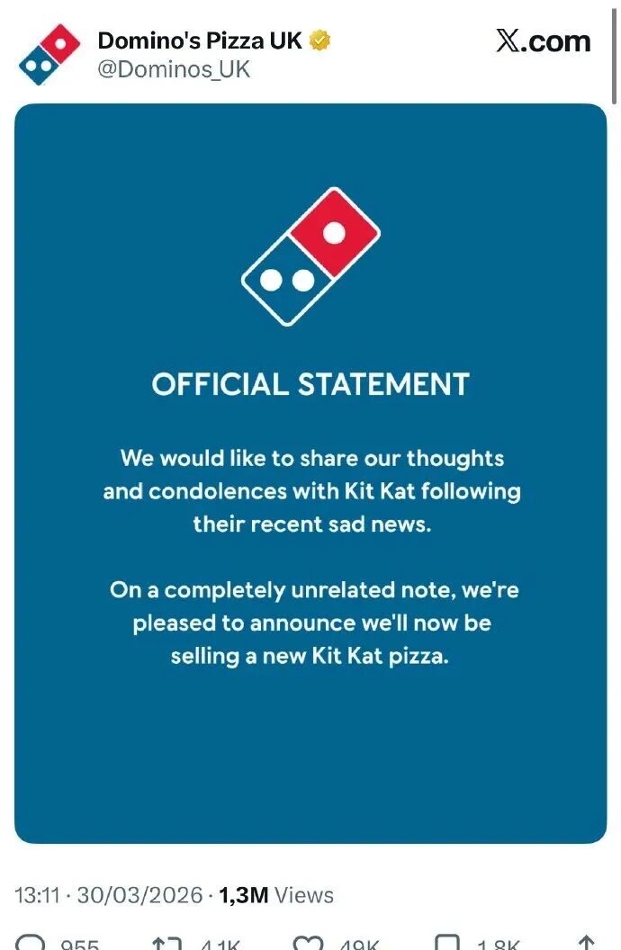 达美乐披萨:表示亲切慰问,以及虽然与此无关,但我们要推出KitKat披萨了。