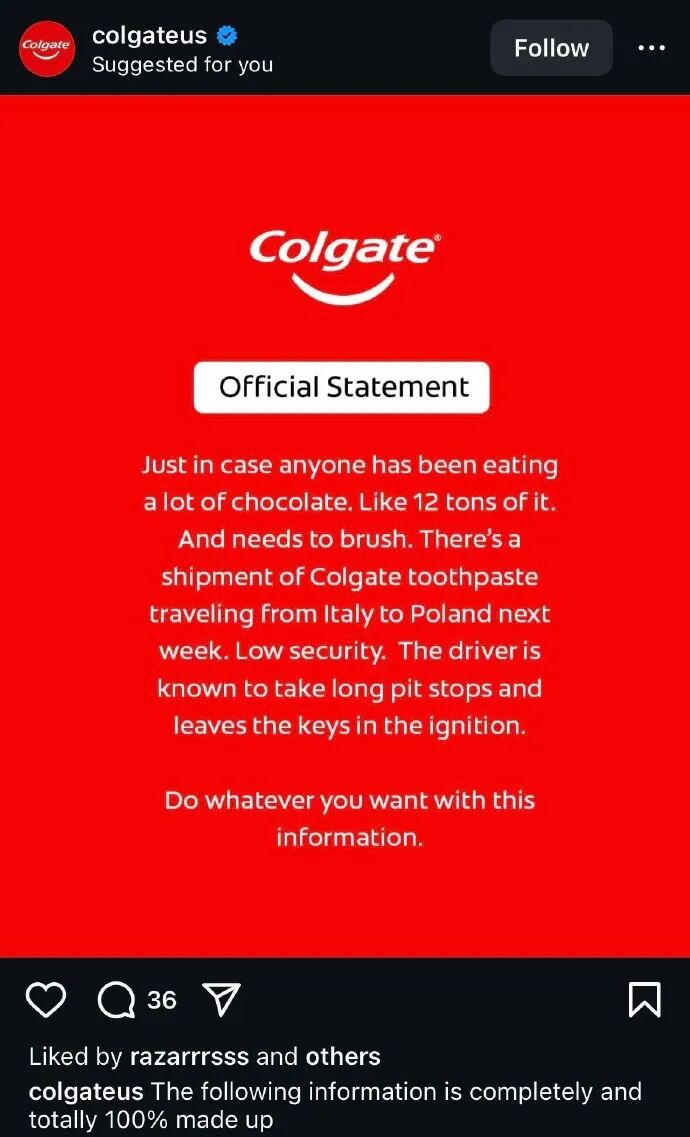 “以防万一有人最近吃了大量巧克力——大概相当于12吨之多——并且需要刷牙的话。下周有一批高露洁牙膏将从意大利运往波兰。安全性较低。据悉,司机会频繁进行长时间的中途停留,并将钥匙留在点火开关上。你可以随意处理这些信息。”