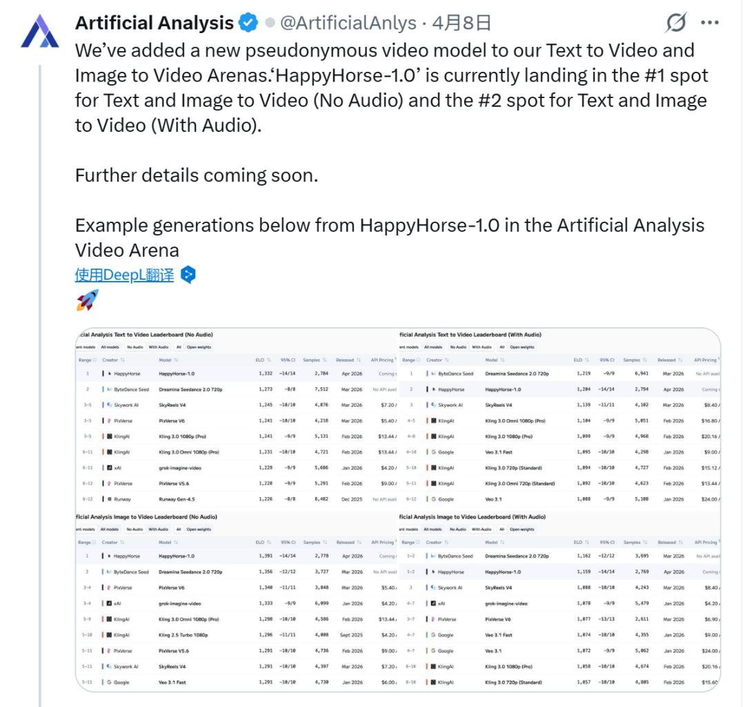 即梦敢于涨价是市场地位的表现。不过,市场总有“黑马”杀出。就在即梦涨价的同一时间,一款名为HappyHorse的视频生成模型空降AI评测分析平台Artificial Analysis的榜首,一时间引发了圈内激烈的讨论。