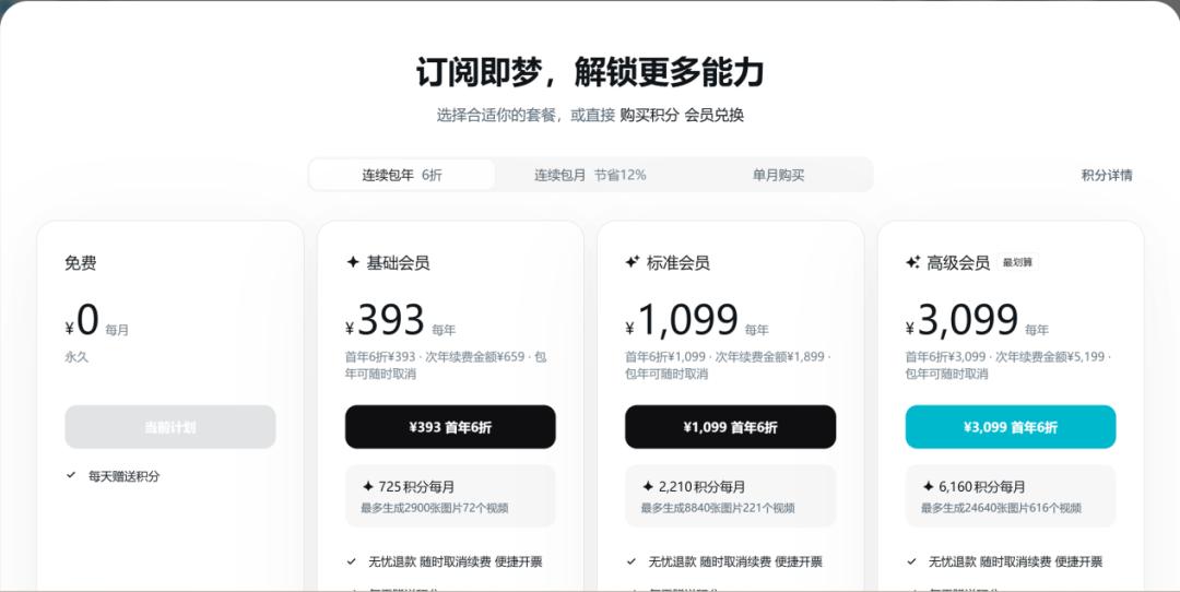 此前,即梦首次充值可以享受五折优惠。整体价位分为三档:基础会员329元/年、标准会员949元/年、高级会员2599元/年。现在,优惠的力度上调至六折,虽然价格只增加了10%,但每档会员每年都需要多交500元。