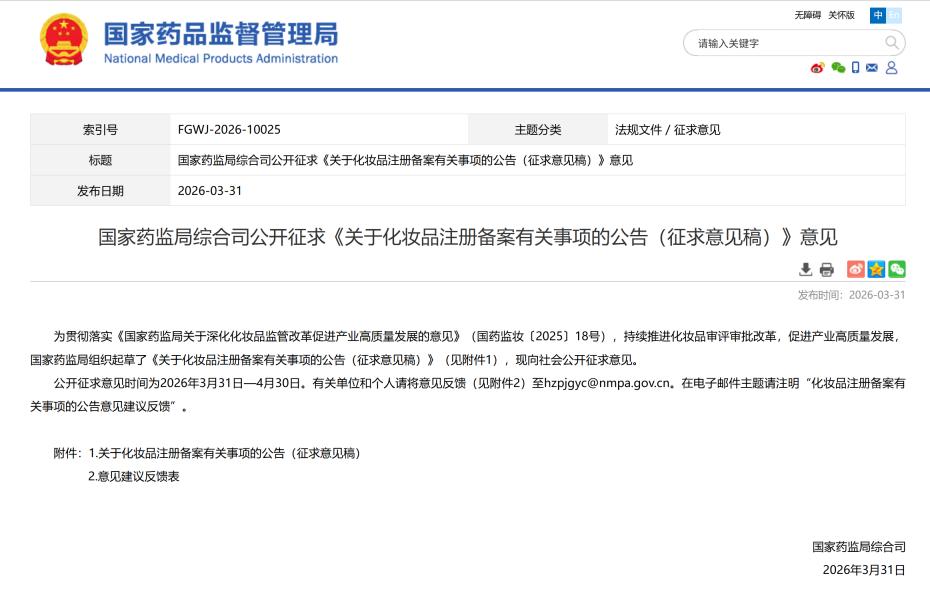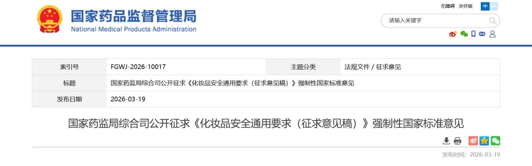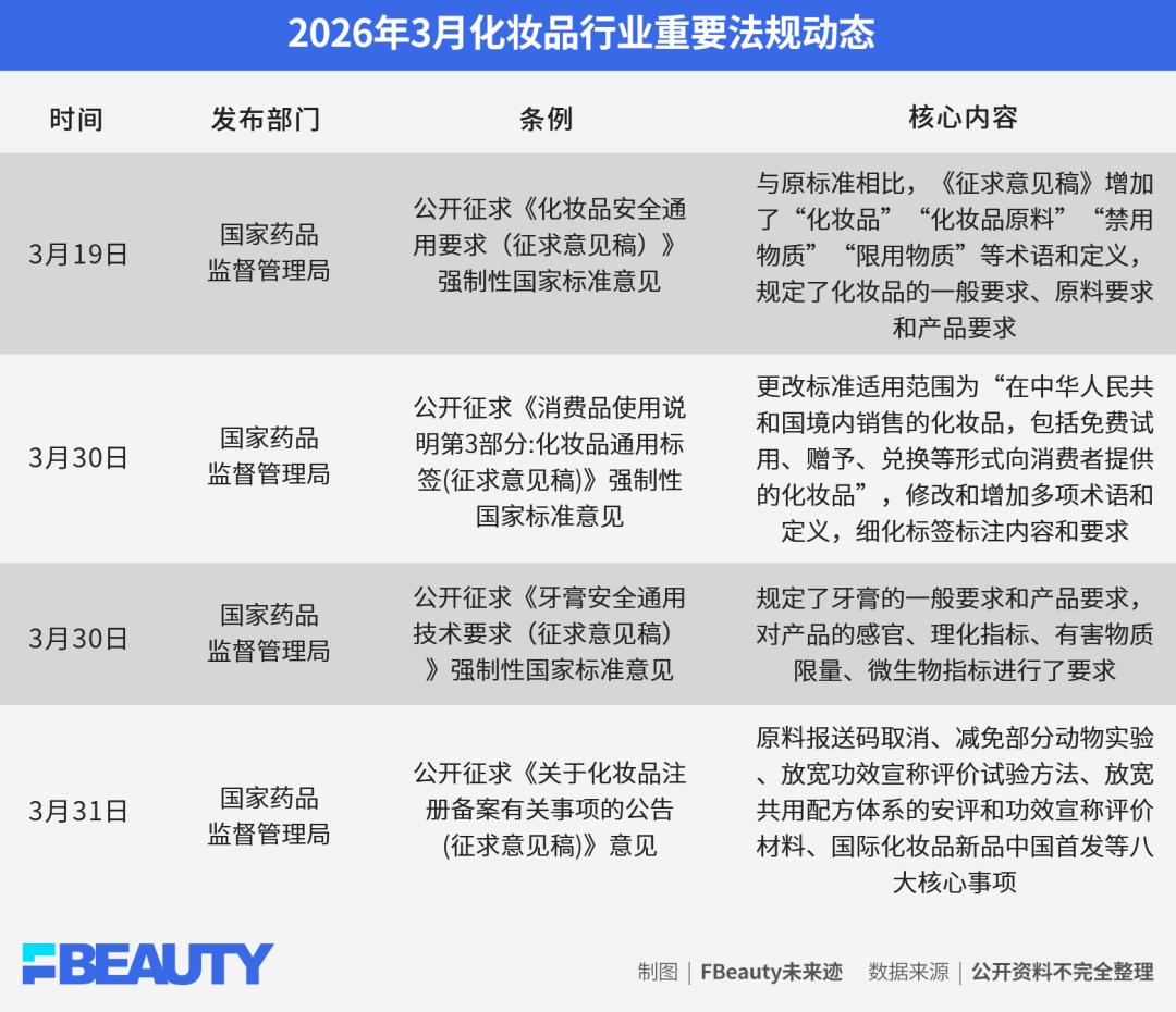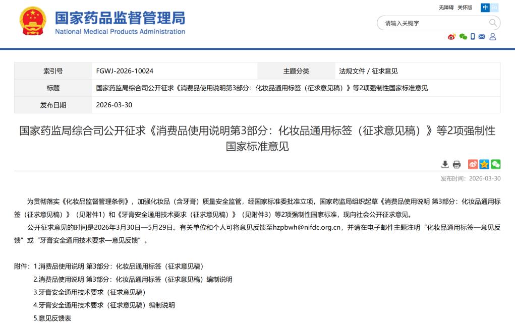 3月30日,国家药监局发布《消费品使用说明 第3部分:化妆品通用标签(征求意见稿)》和《牙膏安全通用技术要求(征求意见稿)》2项强制性国家标准,分别针对化妆品标签管理与牙膏行业监管,完成关键性的制度补全与升级。