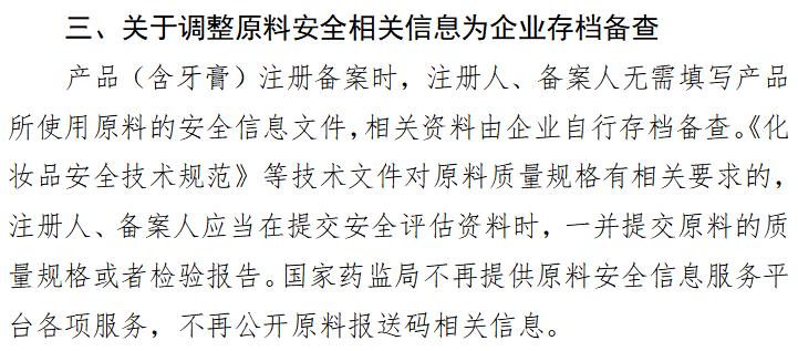 原料报送码的历史要追溯到2021年12月31日,化妆品原料安全信息登记平台的正式上线,拉开了中国化妆品行业原料报送的序幕。而此次出台的文件则明确,产品(含牙膏)注册备案时,无需填写原料的安全信息文件,相关资料由企业自行存档备查,国家药监局不再提供原料安全信息服务平台各项服务,不再公开原料报送码相关信息。