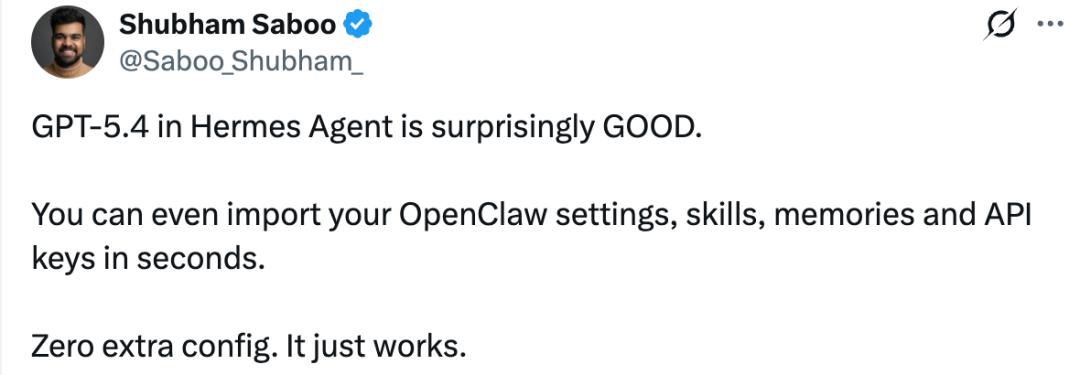 官方还给了从 OpenClaw 迁移到 Hermes 办法。不过也有使用过用户表示,“我大概不会直接替换掉现有的 Claude Code 工作流,但把 Hermes 并行挂在旁边,专门负责常在线消息处理和个人助理这一层,确实很有吸引力。”