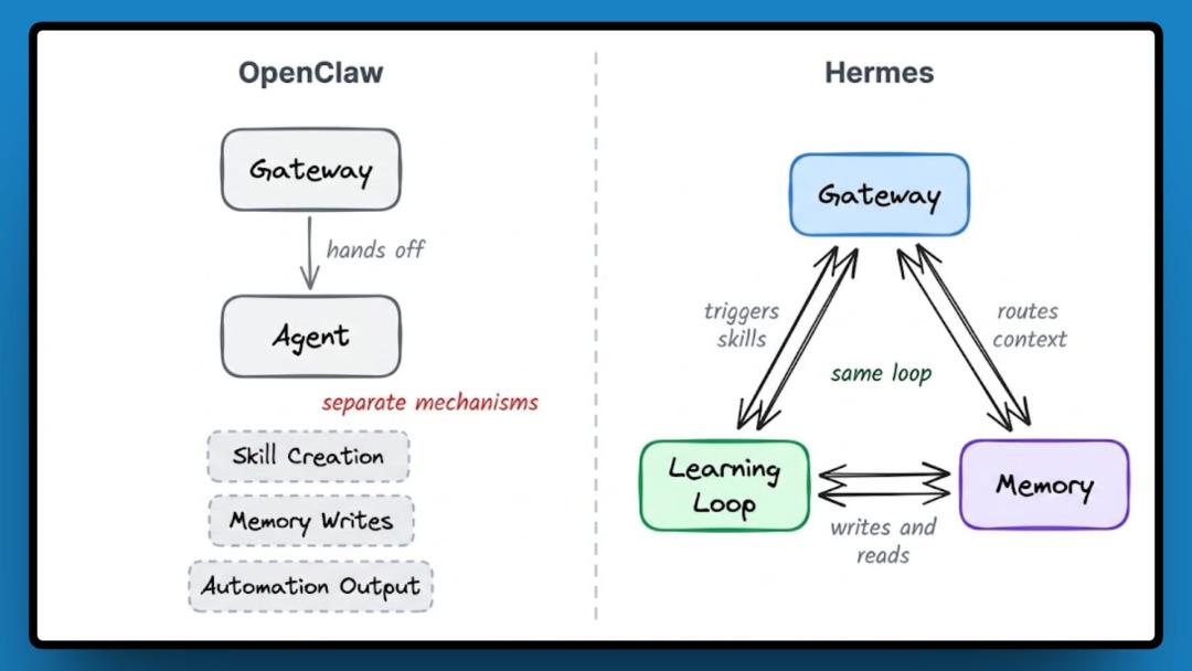 在 OpenClaw 中,网关的主要职责仅为交付,skill 创建、记忆写入、定时自动化输出等功能均采用独立机制实现,与网关不在同一个循环中。而在 Hermes 中,网关本身就是同一个循环的一部分:收到一条消息可直接触发 skill 创建;定时自动化任务的输出,也会通过同一个网关层反馈给用户。之所以能实现真正的跨平台连续性,核心原因就是会话路由被直接集成到整个系统中,而非后续额外拼接。