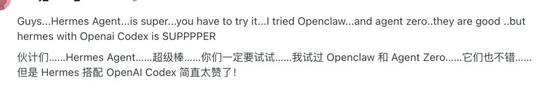 “我试过 OpenClaw、Nanobot、Nanoclaw 等等,但 Hermes Agent 是我最喜欢的。它把我真正关心的功能都做进去了,同时又没有那些臃肿累赘的东西。”有用户表示。