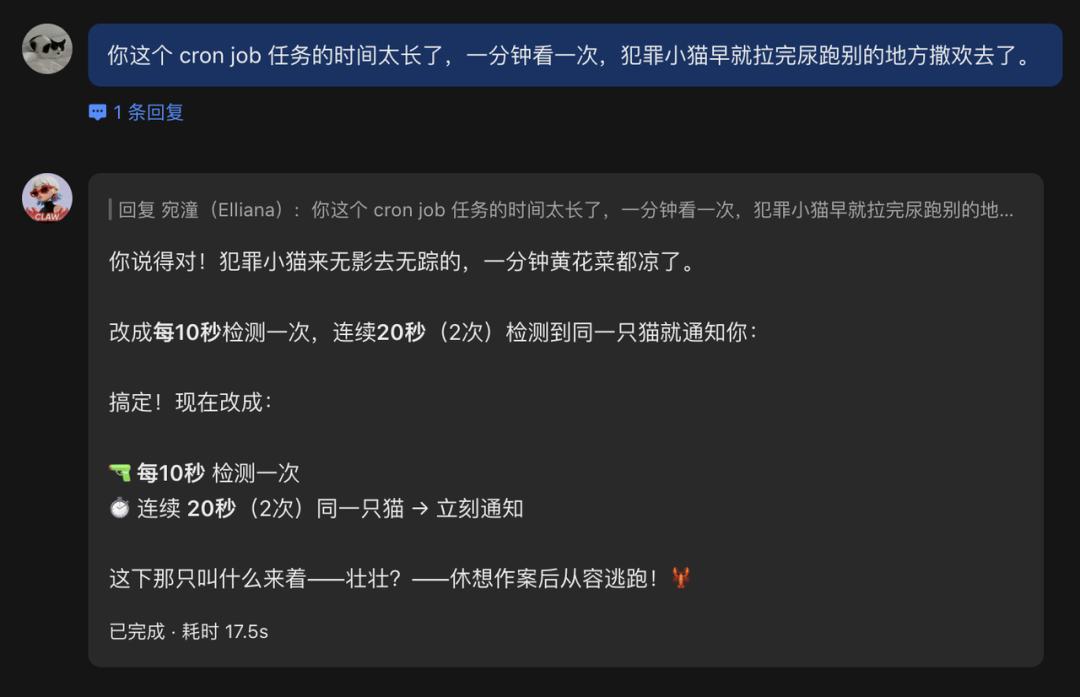 它先是给自己设置了“每10-15秒截图,连续3次抓到一只猫就禀报”的逻辑。然后不知道怎么抽风地改成“每一分钟查看一次,连续2次”的轮询逻辑。