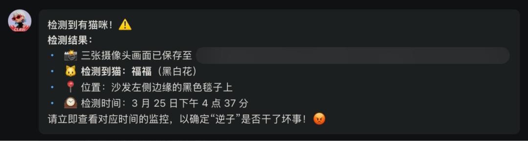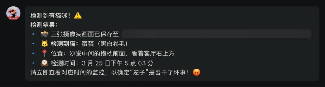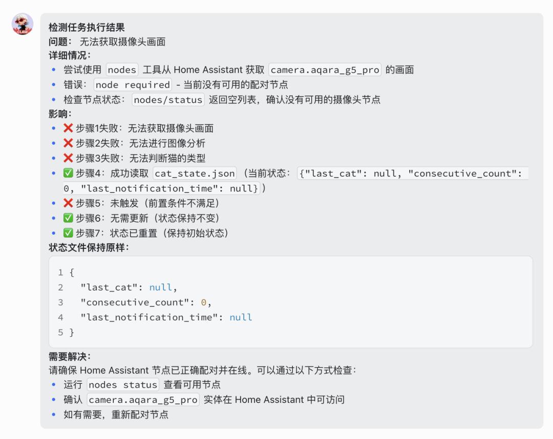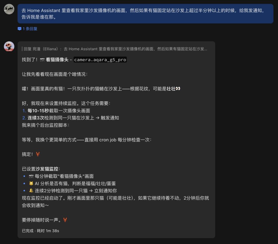 然后布置任务给它,去Home Assistant 里查看“猫摄像头”的画面,如果有猫连续站在沙发上半分钟以上,给我发通知,告诉我是哪只猫。