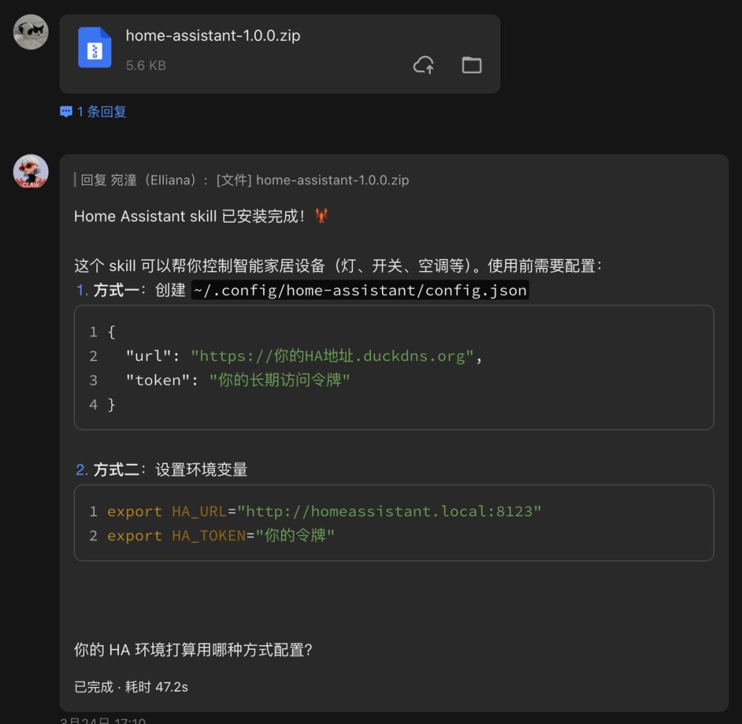 它问我要我家 Home Assistant 的外网访问地址和令牌。哪怕中途遇到问题,比如发现我没安装对应的代码指令,它会自己先想想办法,如果发现是我的原因再来找我,不会事事都来禀报。