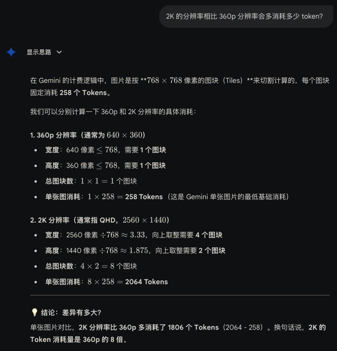 Gemini 说,如果是让它来干这活儿,2K 的 Token 消耗量是 360p 的8倍。
