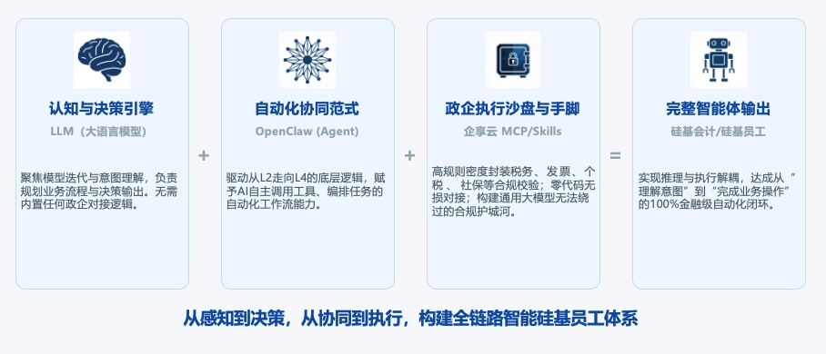 双方实现了真正的推理-执行解耦:大模型无需内置任何政企对接逻辑,发出符合Skills规范的调用指令,即可获得确定性的执行结果。这与OpenClaw在消费场景实现的"对话工具→自主执行系统"跨越,底层逻辑完全一致——只不过企享云解决的是政企场景中规则密度更高、合规要求更严的那一层。
