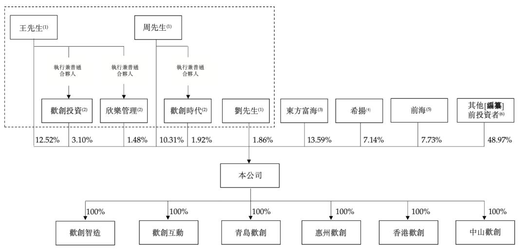 IPO前,联合创始人王健直接持有欢创科技12.52%股份,通过控制欢创投资、欣乐管理分别持股3.10%、1.48%;周琨直接持股10.31%,通过控制欢创时代持股1.92%;刘屹持股1.86%。上述股东通过一致行动安排,合计持股约31.20%,为欢创科技单一最大股东。